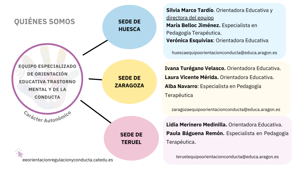 Somos el Equipo Especializado de Orientación Educativa en Trastorno Mental y de la Conducta de Aragón. Desde el presente curso escolar (2025-2026), hemos comenzado a trabajar con ilusión y compromiso en la mejora de la respuesta educativa a las necesidades relacionadas con la salud mental y la conducta. Nuestro carácter es autonómico, pero contamos con sedes en Huesca, Zaragoza y Teruel, lo que nos permite estar presentes en todo el territorio y ofrecer un acompañamiento cercano a los centros educativos. Esto es esencial para construir vínculos sólidos, escuchar de primera mano a quienes puedan requerir de nuestro acompañamiento y colaborar de manera realista con cada comunidad educativa en su contexto particular.